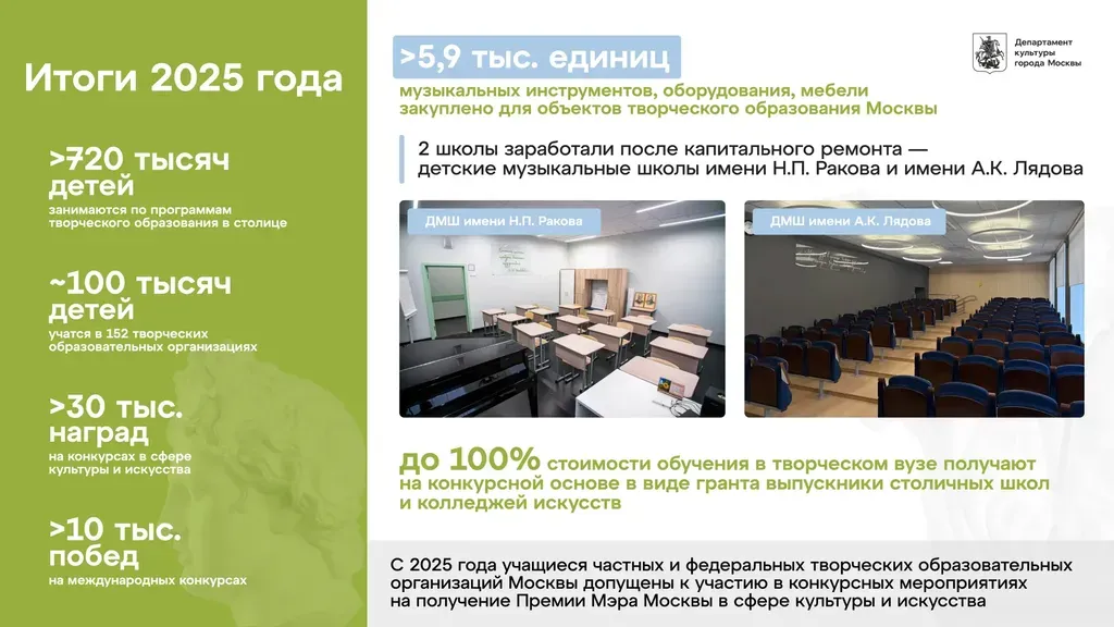 Также город предоставляет гранты для одарённых учащихся детских школ искусств и творческих колледжей — в 2025-м расширен круг соискателей. А выпускники школ и колледжей искусств могут получить компенсацию до 100% стоимости обучения в вузе по творческим специальностям.
